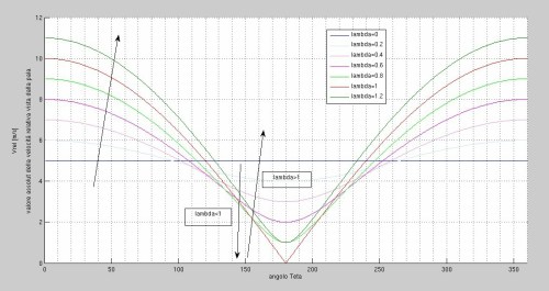 Si veda la figura seguente, nella quale abbiamo ricavato l’andamento del valore della velocità relativa vista dalla pala lungo una rivoluzione completa di angolo Θ, per valori crescenti di λ (λ=0 corrisponde evidentemente al rotore fermo).