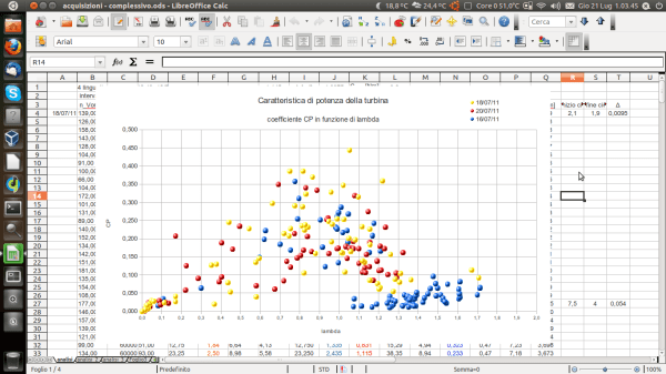 Questi primi dati veri fanno riferimento alla determinazione delle prestazioni della turbina stessa, e puntano a calcolare il valore di CP (coefficiente di potenza), come rapporto tra la potenza effettiva estratta dalla turbina rispetto a quella totale del vento.