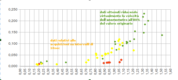 As you can see in the upper graph, yellow dots are the ones coming from real data, speed factor around 1.00: bad! Green dots mean are virtual ones, coming from a numerical reduction to 80% of wind speed measured with the anemometer: these could be good!