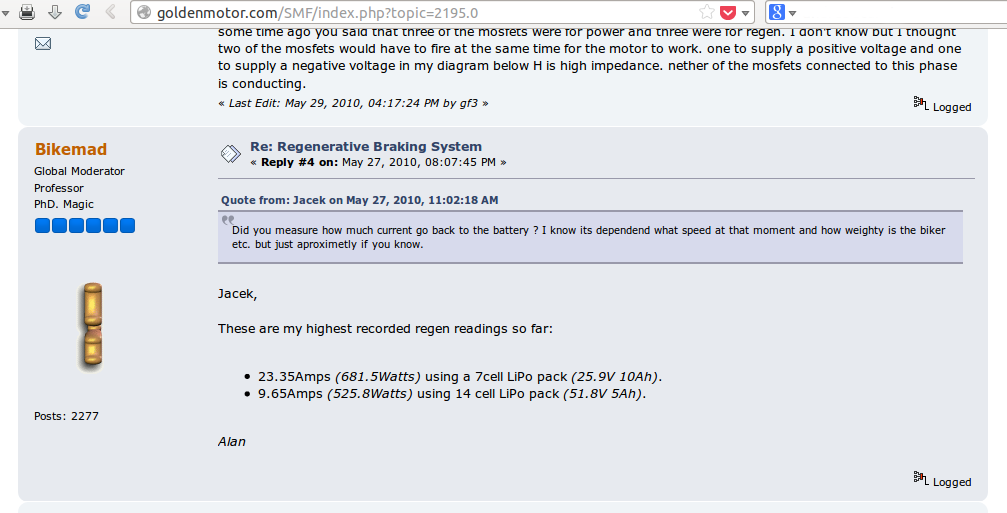 And we are not the first neither the one working on a Goldenmotor hub as a generator. You can see more on Goldenmotor forum (here and here).