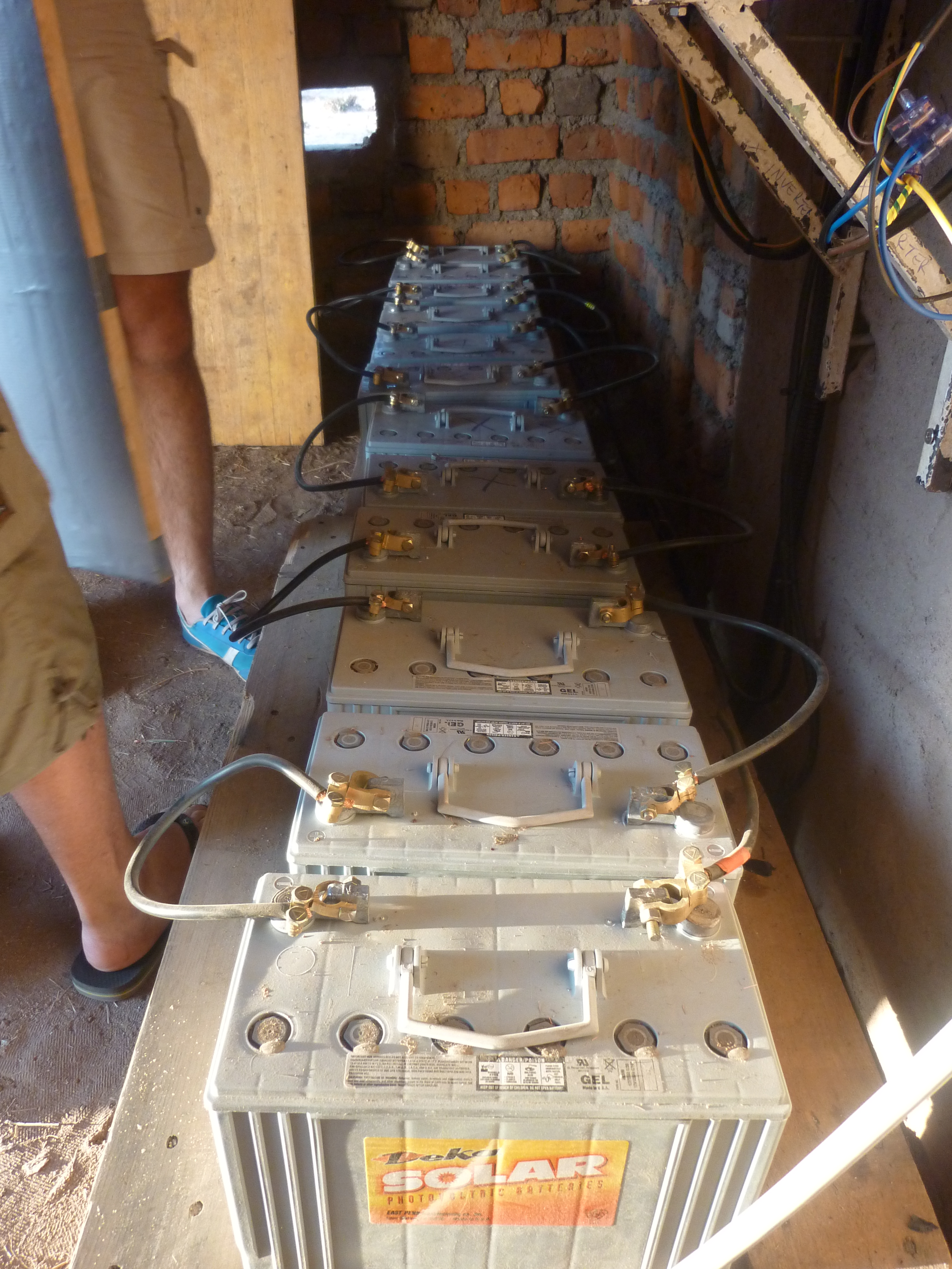 Le 12 batterie DEKA Solar 105Ah acquistate a Dar Es Salaam presso un rivenditore locale avevano lo scopo di immagazzinare l’energia elettrica prodotta dall’impianto eolico costituito dalle due turbine per utilizzarla su richiesta nel pompaggio dell’acqua, almeno per ora, e per altri usi aggiuntivi in futuro, disgiungendo la presenza locale del vento, soprattutto di sera e di notte, con la richiesta di energia elettrica, soprattutto pomeridiana.